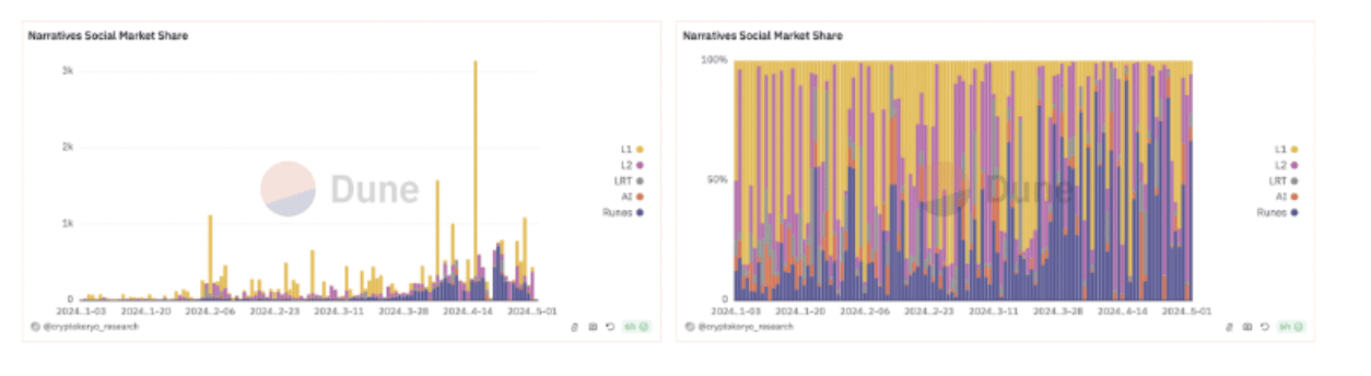 Untuk melacak perubahan tren dalam narasi kripto, Anda dapat menggunakan panel data Narasi Tren Sosial Crypto Koryo untuk analisis. Panel ini menggunakan data sosial Farcaster untuk memberikan analisis mendetail tentang narasi L1, L2, Runes, LRT, dan AI, dengan rencana untuk memasukkan lebih banyak narasi kripto di masa depan.