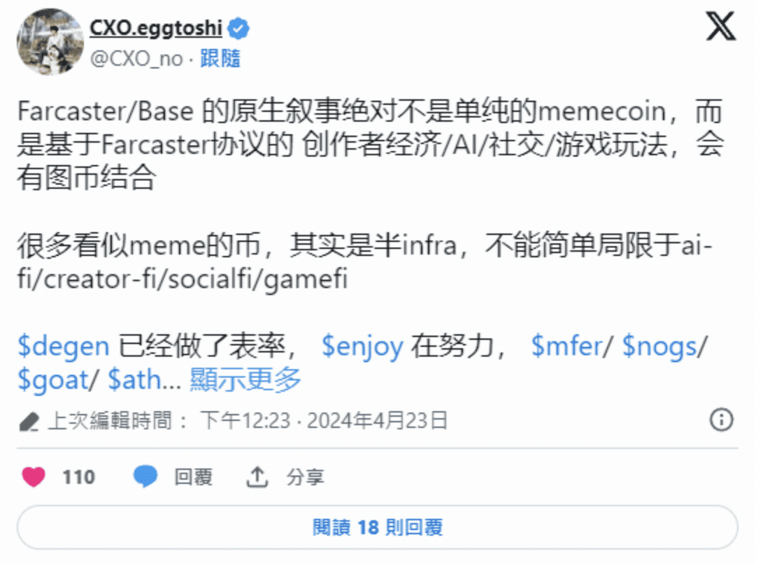 KOL terkenal Mr. Dan (@CXO_no) berkomentar pada akhir April bahwa narasi Farcaster/Base tidak terbatas pada memecoin, tetapi juga mencakup ekonomi kreator, AI, sosial, dan permainan berdasarkan protokol Farcaster, dengan berbagai kemungkinan. Dia lebih lanjut memperkirakan minggu ini bahwa Farcaster/Base akan lebih imajinatif, menunggu "proyek pertama (proyek pertama dalam ekosistem yang mengejutkan Anda)" yang fenomenal yang akan keluar dari lingkaran.
