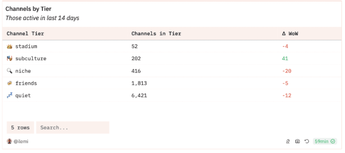 Saluran di Farcaster mirip dengan subreddits, dan ilemi memberi peringkat berdasarkan jumlah tweet, keterlibatan, jumlah pengguna, dan tingkat pengguna. Misalnya, stadion adalah saluran dengan kualitas tertinggi dan harus memiliki lebih dari 250 tweet, skor keterlibatan lebih dari 100.000 poin, dan lebih dari 10 pengguna tingkat tinggi.