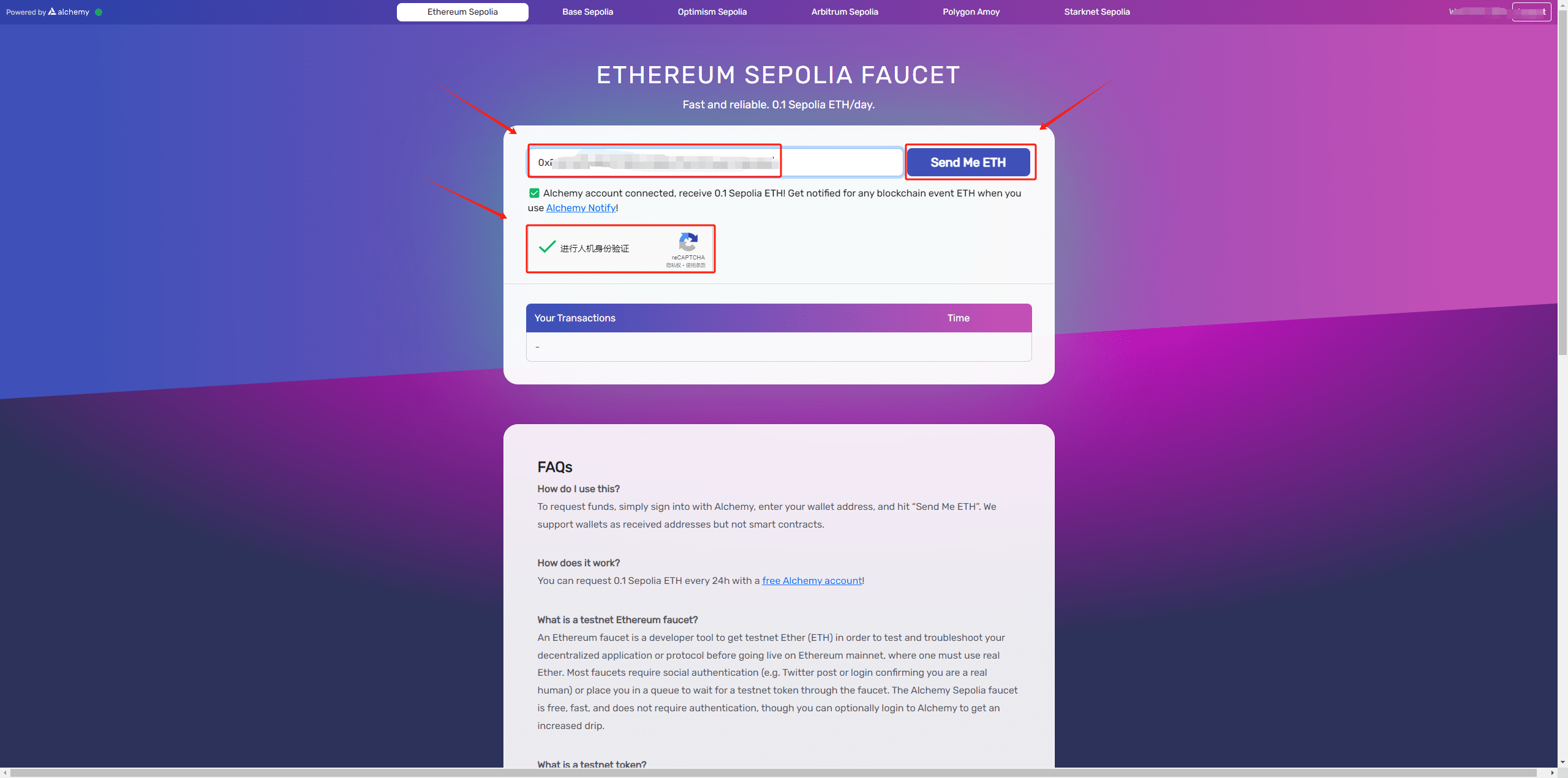 Isi alamat EVM Anda, selesaikan verifikasi manusia-mesin, dan klik untuk mengirim ETH (Anda harus mendaftar pertama kali di website ini)