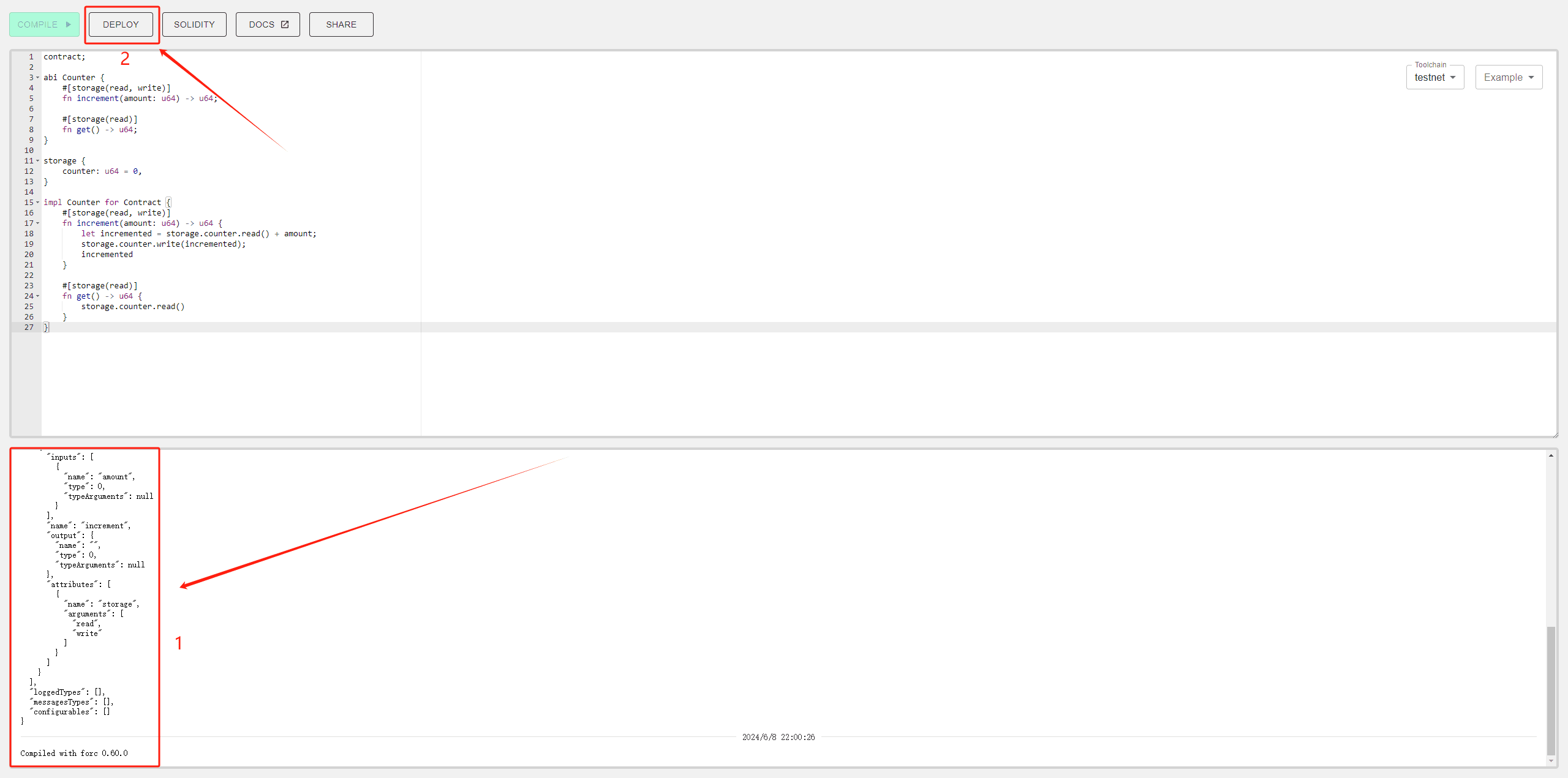 Kemudian tunggu beberapa saat, setelah proses dibawah ini selesai kita klik DEPLOY pada kolom atas untuk menghubungkan wallet kita