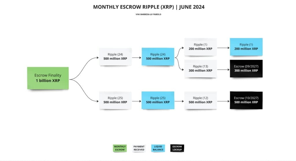 Dal 2017, Ripple sblocca 1 miliardo di token ogni mese tramite depositi di garanzia. A partire da maggio 2024, l'azienda utilizza i portafogli "Ripple (24)" e "Ripple (25)" per gestire questi depositi a garanzia, che continueranno fino a gennaio 2025. Il 1° luglio "Ripple (24)" sbloccherà 500 milioni di XRP in due depositi in garanzia (100 milioni e 400 milioni), mentre "Ripple (25)" sbloccherà un singolo deposito in garanzia di 500 milioni di token.