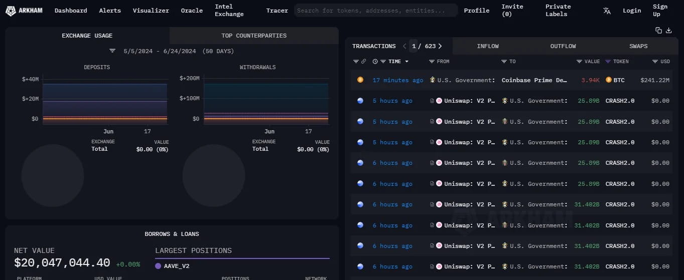 Secondo i dati di Arkham Intelligence, un portafoglio crittografico noto per essere controllato dal governo degli Stati Uniti ha recentemente trasferito circa 3.940 Bitcoin (BTC), per un valore di 241 milioni di dollari, a Coinbase. Il portafoglio attualmente contiene circa 13,3 miliardi di dollari in Bitcoin. Questa cenere è legata al sequestro di Bitcoin da Silk Road, un noto mercato del dark web che è stato chiuso nel 2013.