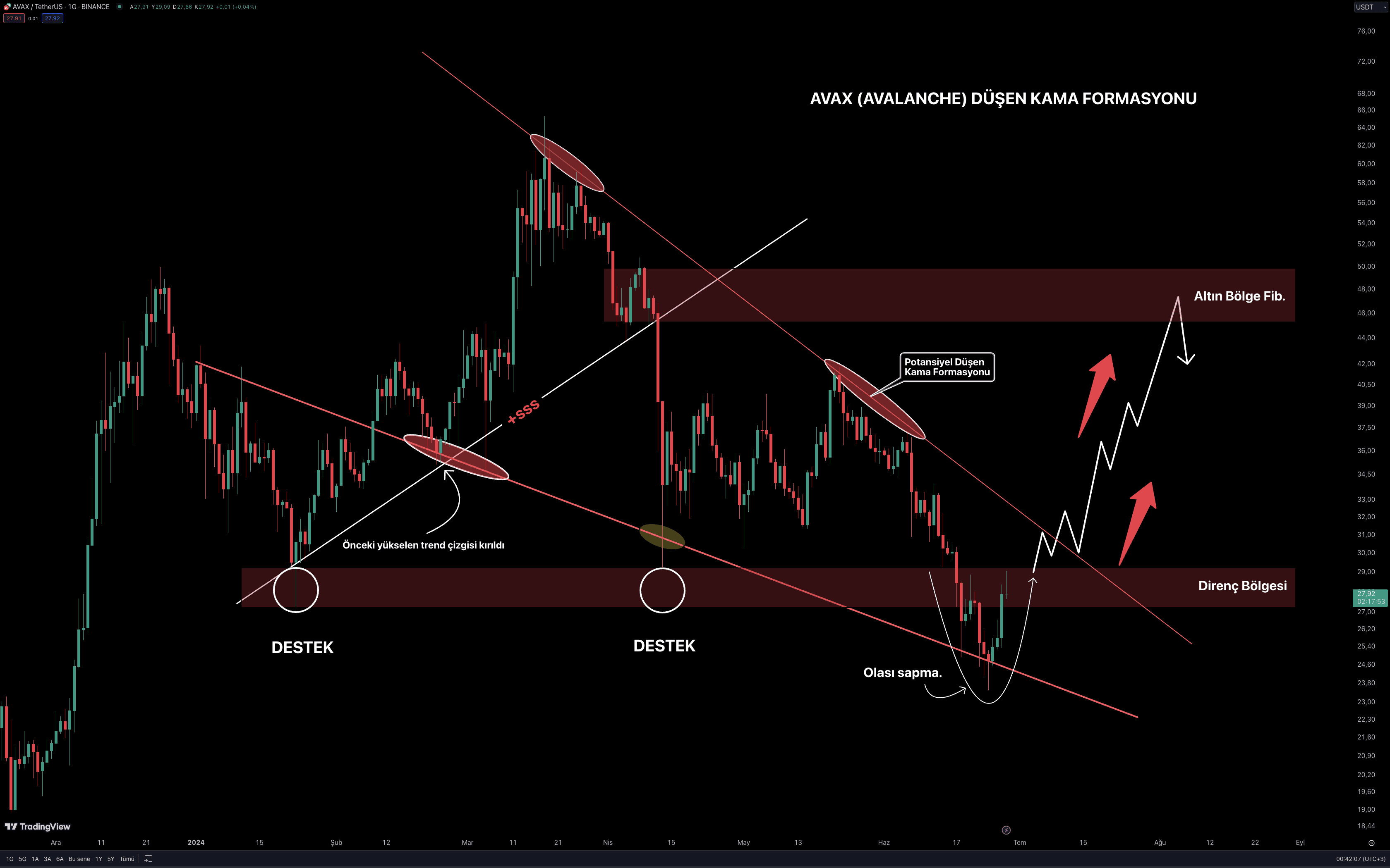 $AVAX C'è una formazione di cuneo cadente che può verificarsi in . Con una possibile deviazione dalla precedente zona di supporto, il prezzo tocca la fascia inferiore della formazione del cuneo discendente e osserviamo immediatamente il movimento dei prezzi nella regione che in precedenza si era trasformata da supporto a resistenza. Se riesce a rimanere all'interno della scatola che si è trasformata da supporto a resistenza, tocca la banda superiore della formazione a cuneo discendente (trend al ribasso) e rompe verso l'alto, il prezzo raggiungerà la zona d'oro Fib. Sarà probabile che si troverà ad affrontare la zona di resistenza, che è il livello. Quando calcoliamo il margine di profitto del livello che ho menzionato (zona d'oro fib.) dal livello di prezzo attuale, c'è un margine di profitto dell'80% per lo stoppino e del 60% per la chiusura della candela. Divertitevi a guardare...