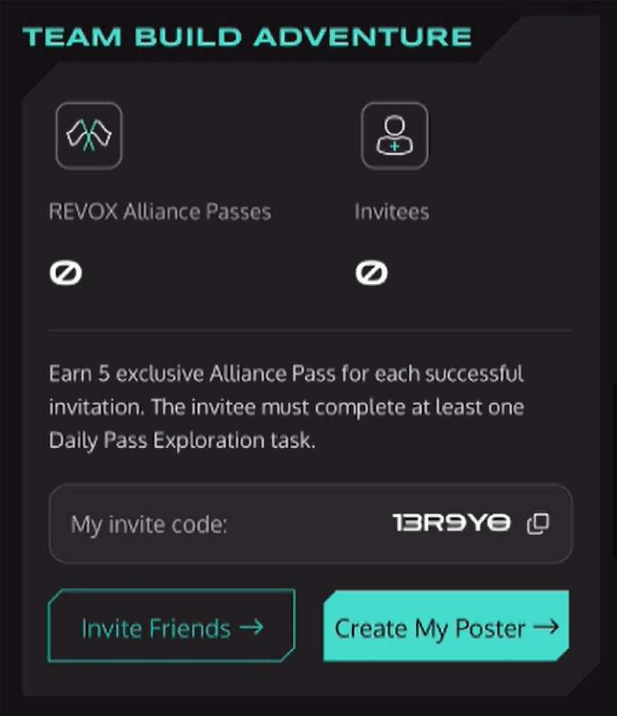 Iniziamo con il processo completo di airdrop. Innanzitutto, apri l'app mobile Binance e accedi al portafoglio web3. Possiamo vedere la colonna airdrop che mostra Revox sopra. Dopo aver fatto clic, possiamo vedere la pagina dell'evento essere condiviso. Viene convertito in base ai Revox AI Pass e ai Revox Alliance Pass e viene convertito in punti airdrop in base al valore dei punti di tutti. Poiché il modello di token come la circolazione totale di $ RGT non è stato ancora rilasciato, quindi gli amici in valuta possono farlo partecipa. Ci saranno le ultime novità in futuro. Aggiornamento nel gruppo, ok, il primo può inserire il codice di invito, l'invitante riceverà 5 punti Alliance Pass, gli amici in valuta possono anche inserire il codice di invito di Brother J 13R9YO. , Grazie mille