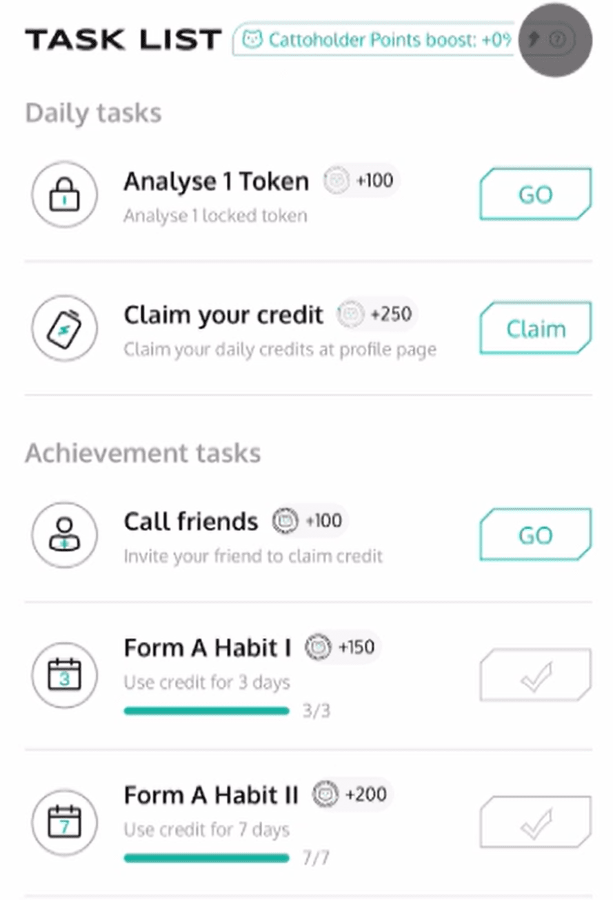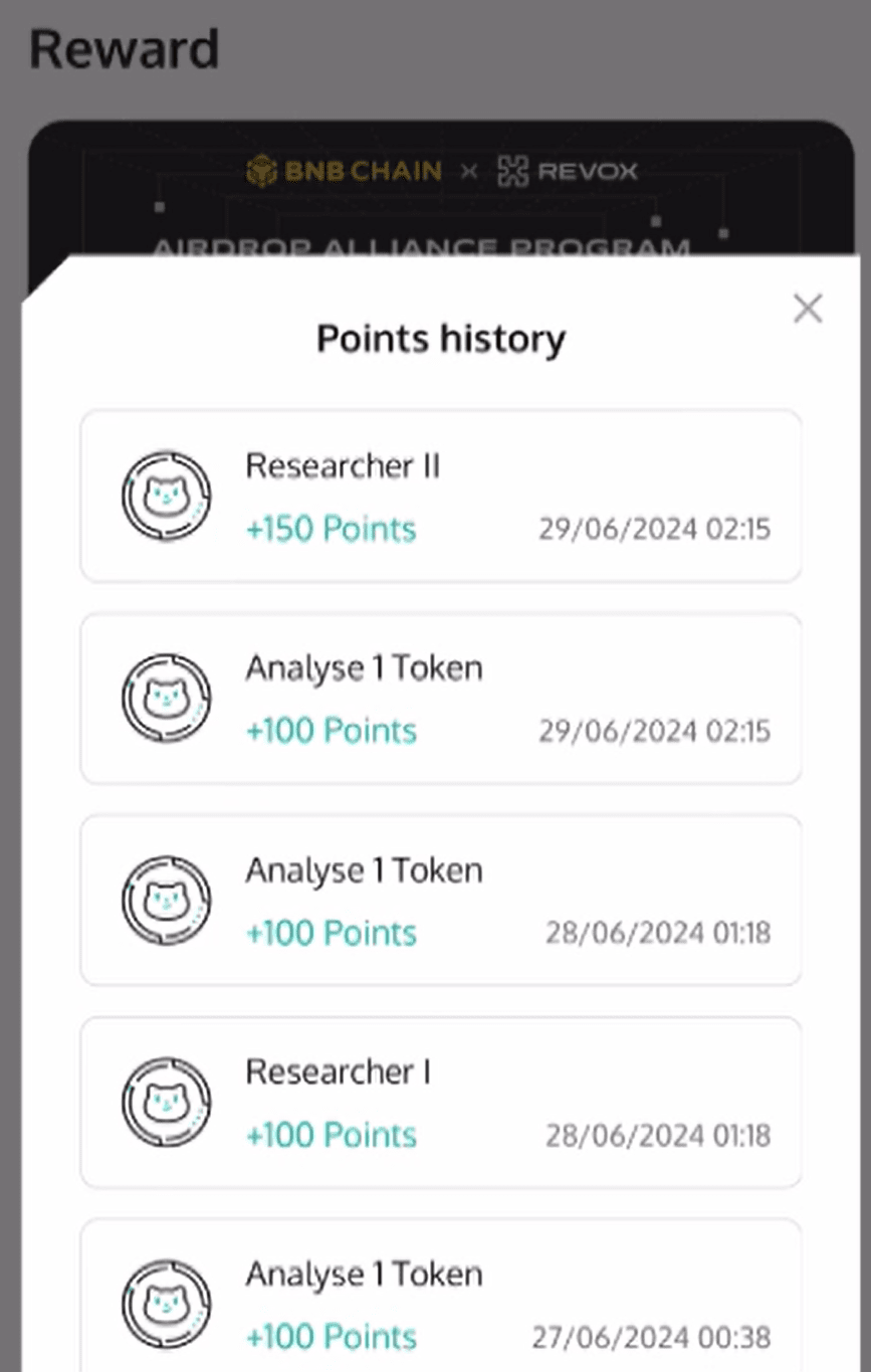 La versione nascosta è qui. C'è un pulsante sotto l'accesso, Experience Revox Lense. Fai clic su di esso e scoprirai che questa è la pagina dell'evento di Revox. È diversa dall'evento Binance portafoglio e puoi vedere il portafoglio. Attività correnti, di seguito sarà anche un'introduzione all'attuale andamento valutario nel circolo valutario. Facciamo clic su Profilo e quando entriamo, possiamo scoprire che abbiamo crediti giornalieri è importante per noi ottenere punti extra. L'importo assegnato giornaliero è 20. Se vuoi acquistarne di più, puoi acquistarlo in crediti cumulativi e spendere fondi in catena per ottenerlo sei interessato al progetto e hai fiducia, puoi provarlo, altrimenti non sei sicuro Sotto la ricompensa, il rischio di contro-rotolamento sarà molto alto Quindi clicca su Ricompensa. I Punti visualizzati qui sono quelli Le attività di Binance verranno assegnate a noi, ma non esiste un limite massimo, il che significa che finché partecipi alle attività qui, i premi ottenuti saranno maggiori rispetto alla partecipazione all'intera attività di Binance. Di seguito sono riportate le attività quotidiane e le attività di raggiungimento. Inoltre, gli utenti che detengono Catto possono anche aumentare la percentuale di punti guadagnati. Le attività qui riguardano più o meno l'utilizzo del credito e lo sblocco dei token, è possibile ottenere punti diversi dopo il completamento. Tornando a quanto detto prima, purché si faccia clic su analisi di vari token che non sono stati sbloccati, puoi vedere i risultati di Revox analizzando questo token tramite l'intelligenza artificiale e completare le nostre attività allo stesso tempo, anche se è previsto che tu possa continuare a operare su questa pagina dopo l'evento Binance termina. Il calcolo del volume degli airdrop terminerà ufficialmente prima del TGE. Non devi perdertelo se hai tempo libero ogni giorno.