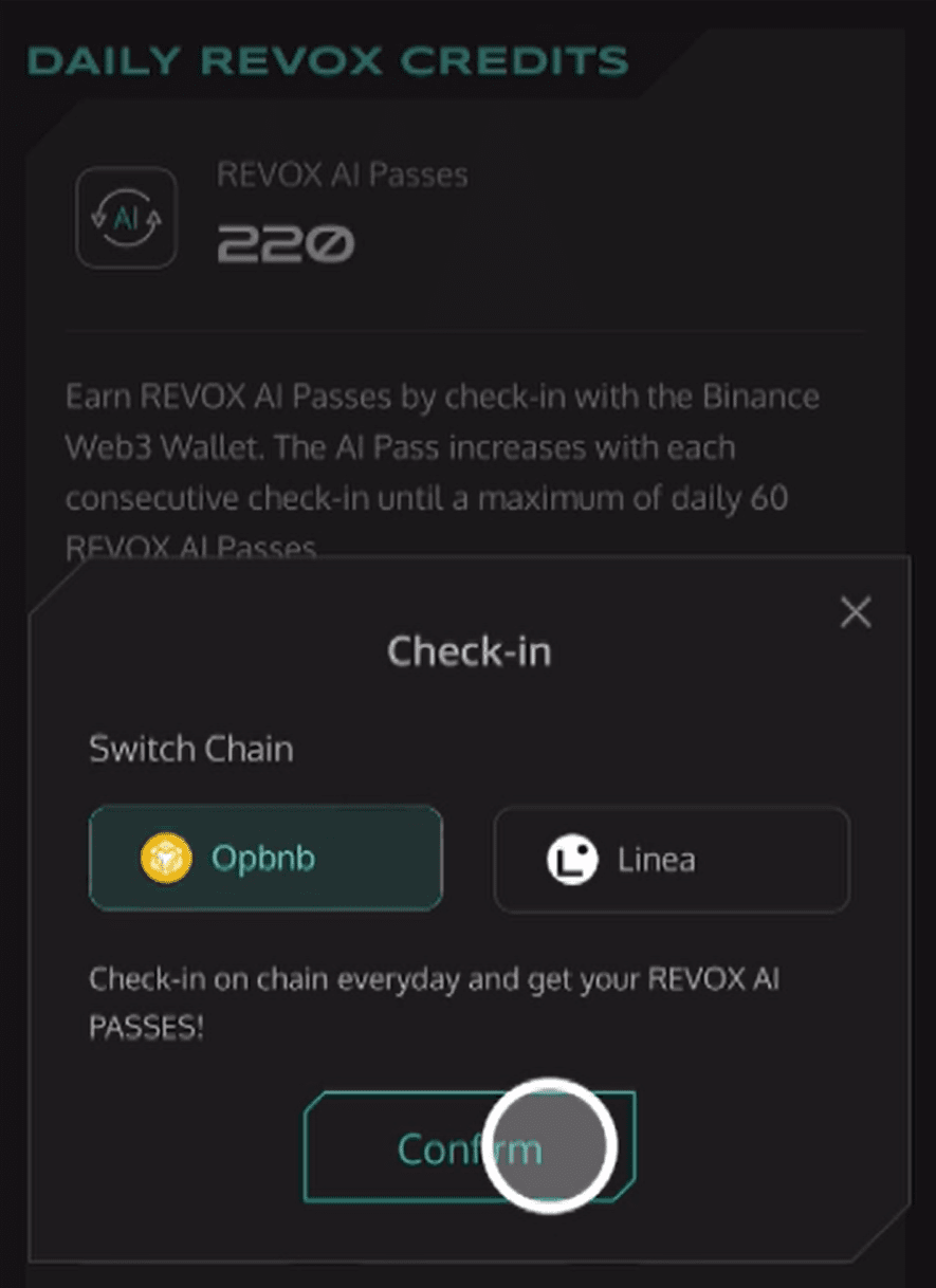 Di seguito è riportato il Social Task, il che significa che devi tracciare l'account ufficiale X di Revox e il portafoglio Binance e inserire il tuo @ID Twitter di seguito. Dopo 24 ore, 100 punti AI Passes verranno facilmente accreditati sul tuo account, seguiti dal check-. nell'attività, fai clic su Check-in, verrà visualizzata la catena pubblica a cui scegliere per accedere. A questo punto, scegli la catena Opbnb più economica, premi Conferma e verrà visualizzata l'interazione del contratto Se l'importo è inferiore a NT $ 0,01 è considerato zero. Questa attività di accesso inizia dal primo giorno. I punti AI Pass ottenuti aumenteranno gradualmente quando inizierà il settimo giorno, sarà fissato a 60 punti e potrà durare fino alla fine dell'evento puoi accedere e accedere dopo aver visto il video. Infine, come la precedente LISTA, puoi ottenere i punti forniti dal partito del progetto.