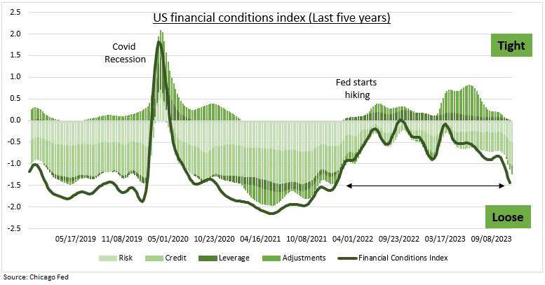 L'indice nazionale delle condizioni finanziarie della Fed di Chicago (vedi grafico) è ora ai livelli precedenti all'inizio del rialzo dei tassi da parte della Fed nel marzo dello scorso anno.