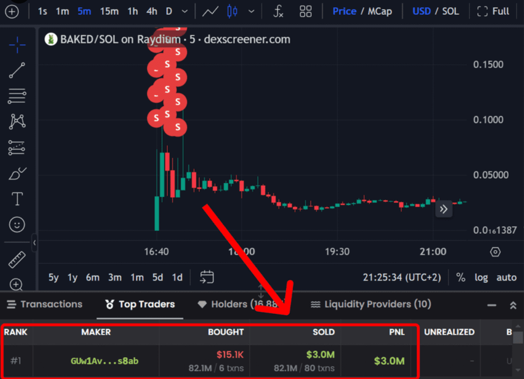 Dopo il lancio del token, lo sviluppatore ha acquisito 300 milioni di $BAKED per 12 $SOL