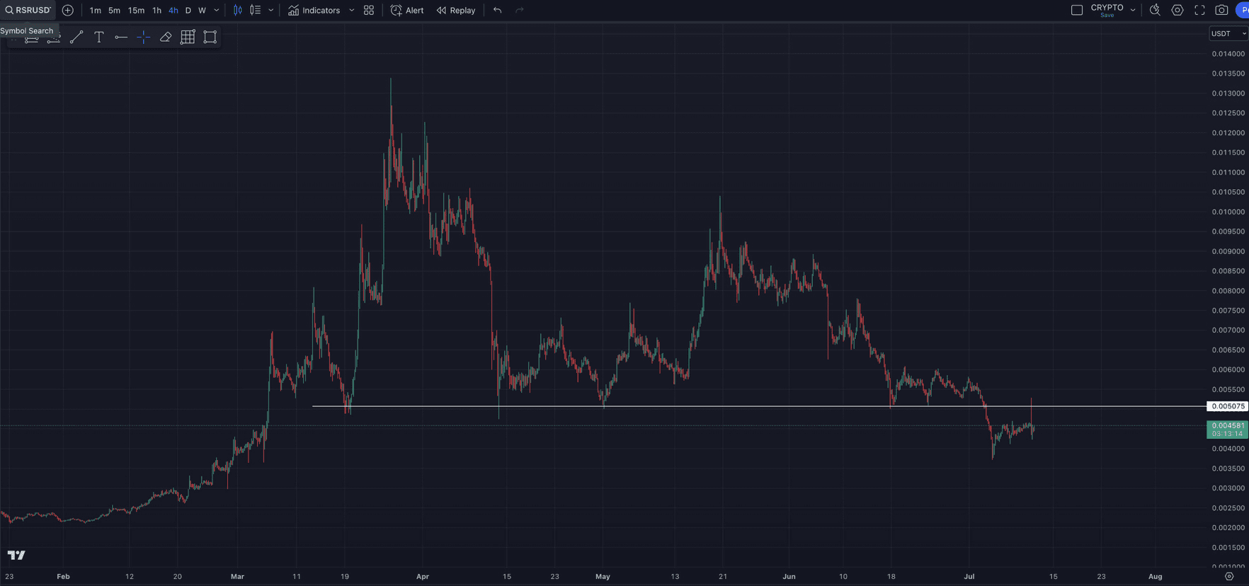 Il grafico a 4 ore di RSR/USDT mostra un livello di supporto significativo che è stato rotto. Questa rottura ha indicato un potenziale cambiamento nella direzione del trend da rialzista a ribassista.