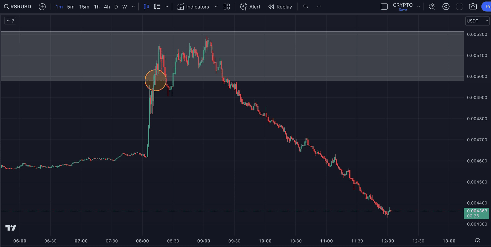 Addentriamoci in un esempio pratico per illustrare come Open Interest può essere utilizzato efficacemente nelle decisioni di trading. Le seguenti immagini e analisi forniscono uno sguardo dettagliato a un trade RSR/USDT.