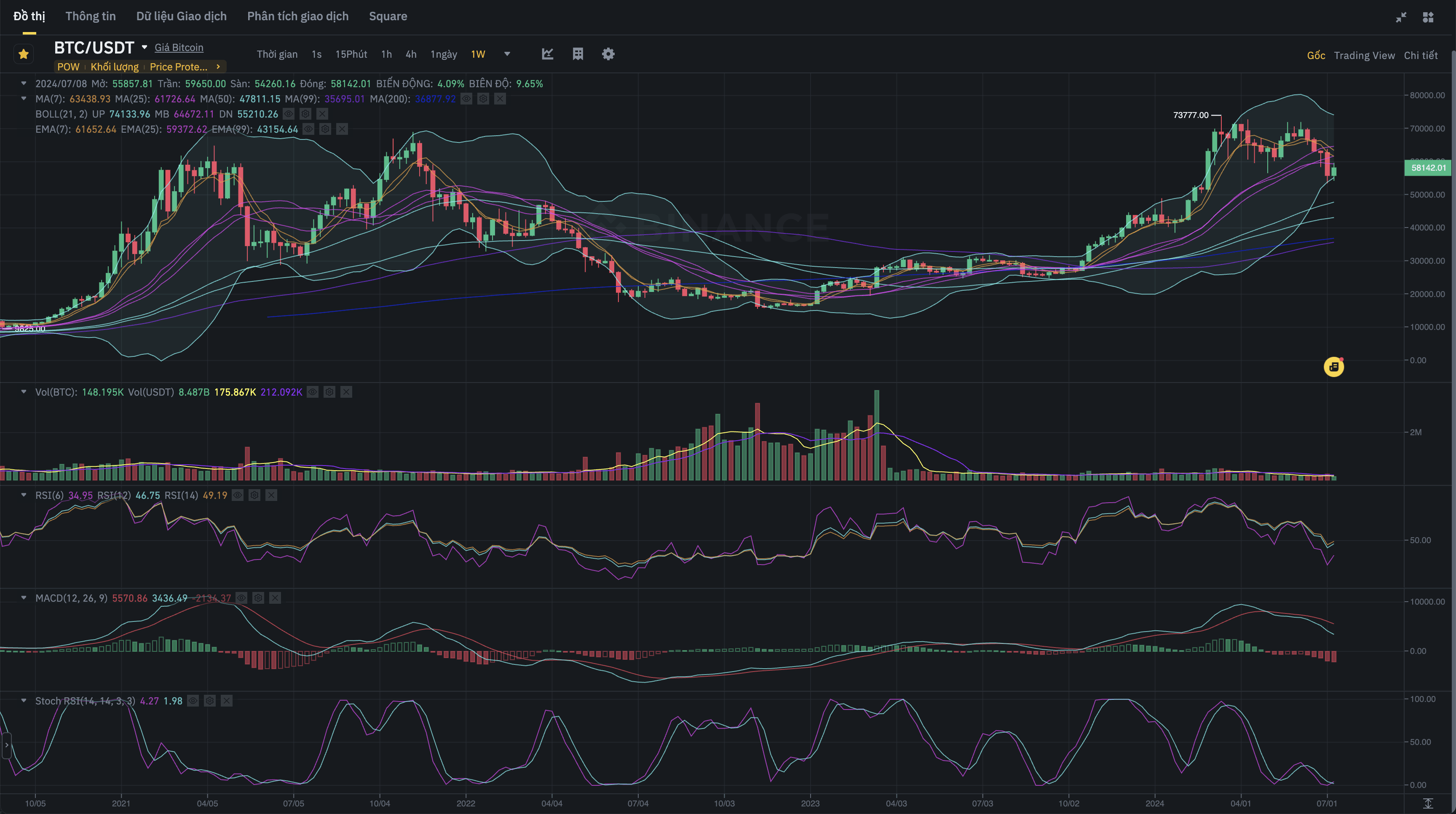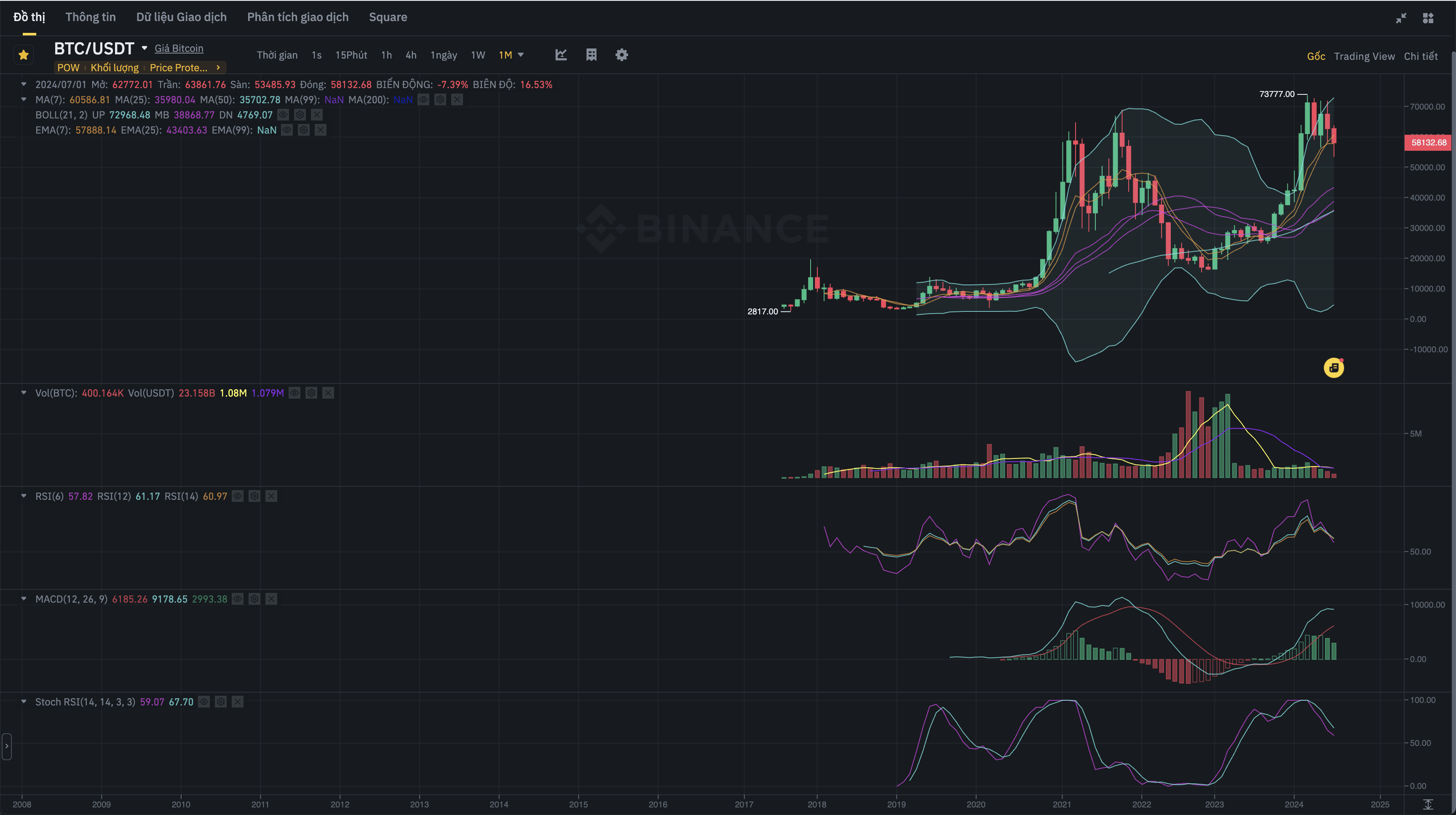 Sull'orizzonte temporale mensile (1M), la tendenza a lungo termine di Bitcoin è ancora in crescita. Osservando la storia dei cicli di dimezzamento, ogni volta che il prezzo si adegua è un’opportunità per accumulare. Questi cicli sono spesso di lunga durata e producono guadagni significativi dopo ogni correzione.