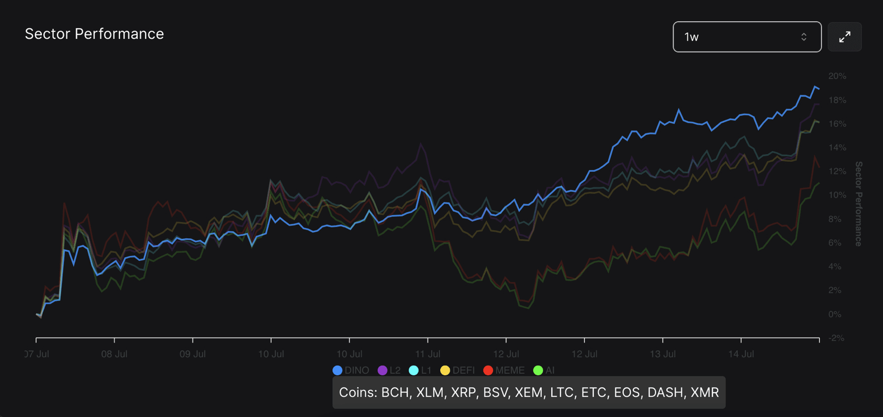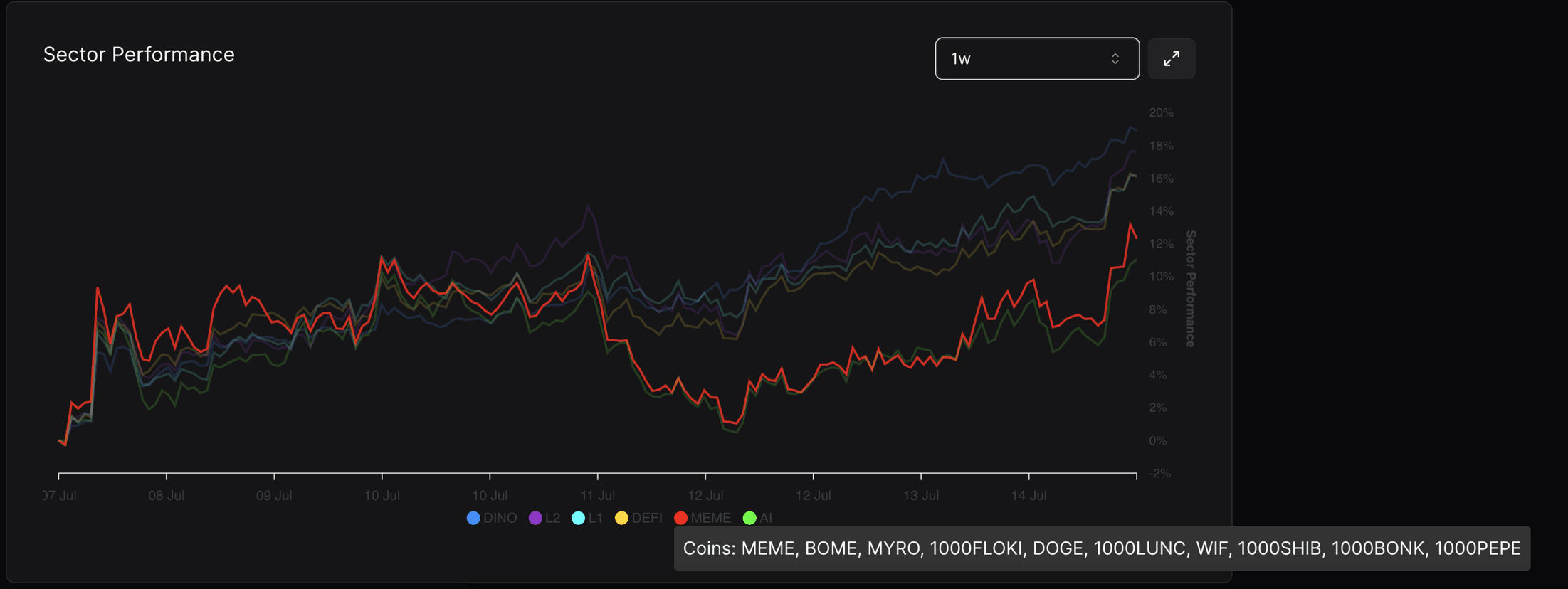 Ogni linea sul grafico rappresenta la performance di un settore specifico. I colori differenziano i settori: blu per DINO, viola per L2, giallo per L1, rosso per DEFI, verde per MEME e un altro verde per AI.