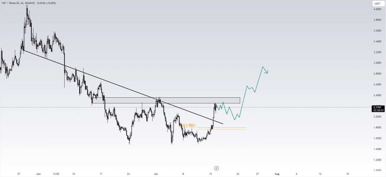 Il WIF ha superato la principale linea di tendenza al ribasso nell'arco di 4 ore, indicando forza e potenziale slancio rialzista. Mentre ci avviciniamo a un forte livello di resistenza, ci sono aree chiave da tenere d’occhio per potenziali acquisti.