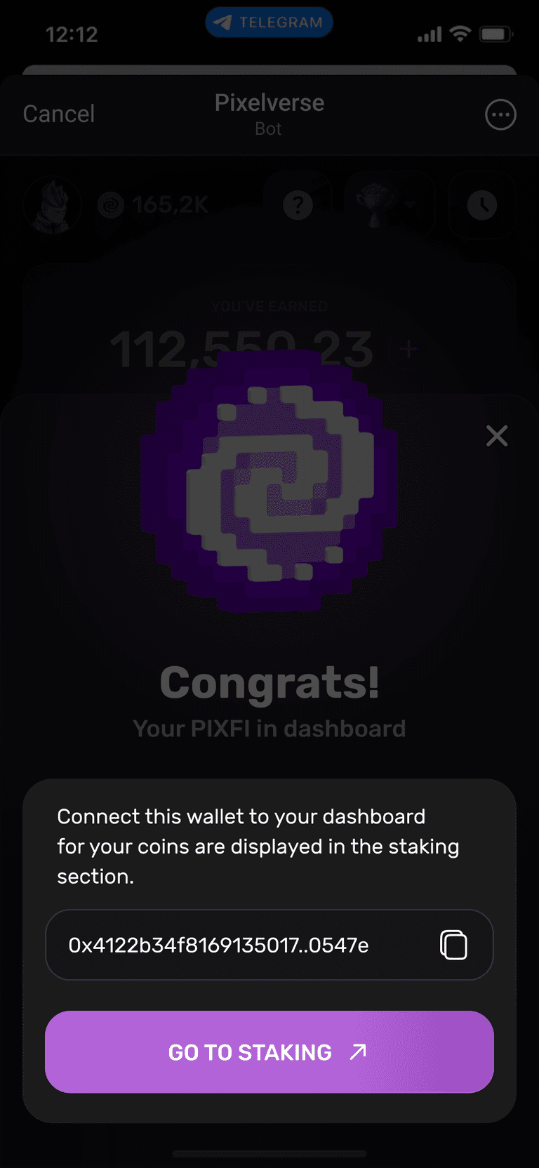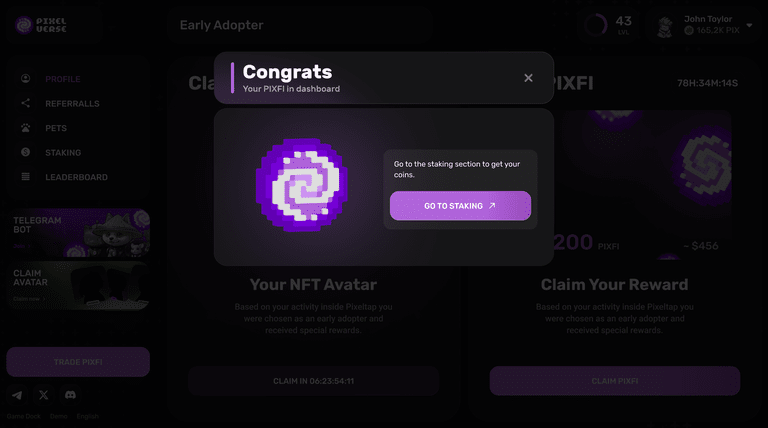 Passaggio 4) Congratulazioni, hai ricevuto i tuoi token $PIXFI! Per gestire le tue risorse, vai su dashboard.pixelverse.xyz/stakes