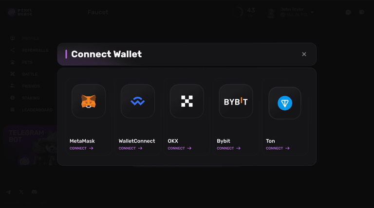 Passaggio 2) Seleziona il portafoglio che desideri e collegalo alla dashboard Pixelverse.