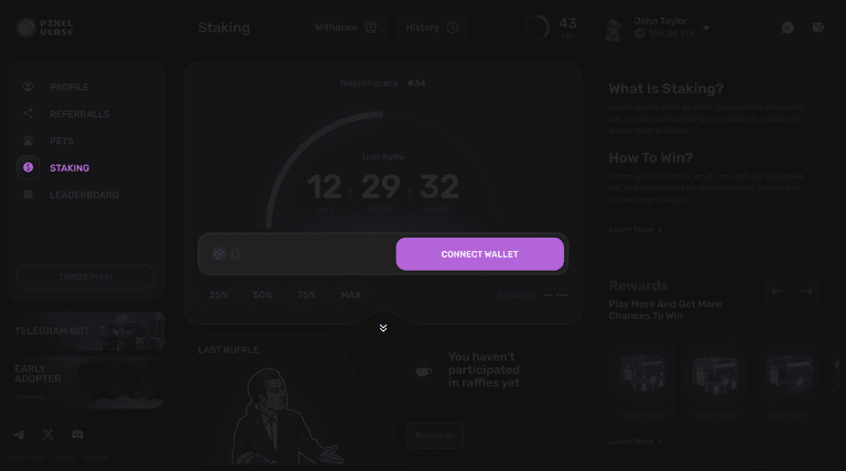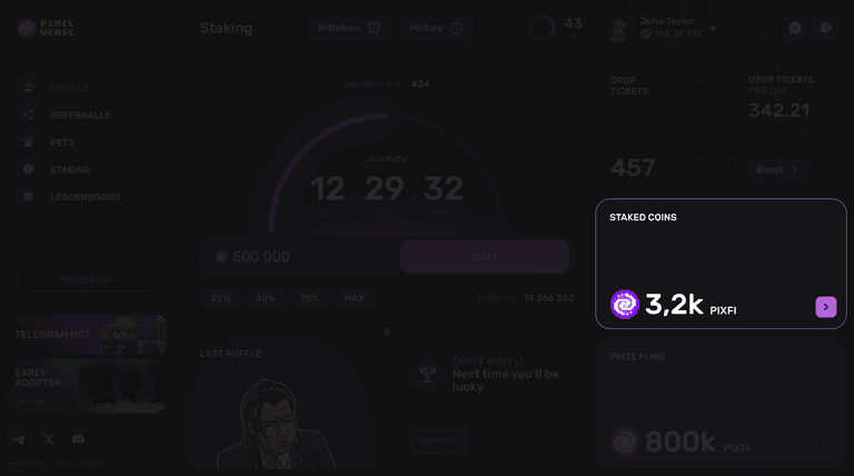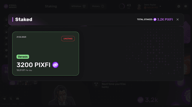 Passaggio 4) Genesis Staking è un modo senza gas per massimizzare il valore in dollari PIXFI. Partecipando alla prima fase del Pixelverse Lifetime Stake, guadagni biglietti che ti consentono di ricevere bottini contenenti varie preziose risorse di gioco.