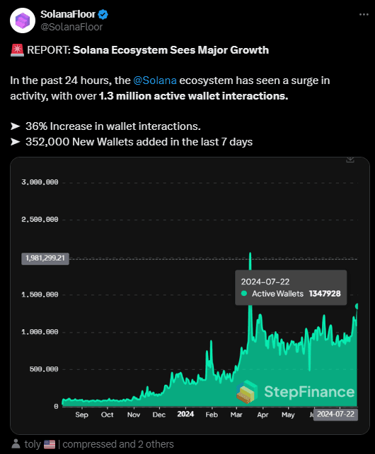 L'ecosistema Solana ha registrato un notevole aumento di attività nelle ultime 24 ore, con oltre 1,3 milioni di interazioni attive del portafoglio registrate. Questa crescita impressionante evidenzia la crescente adozione e coinvolgimento di Solana tra gli utenti.
