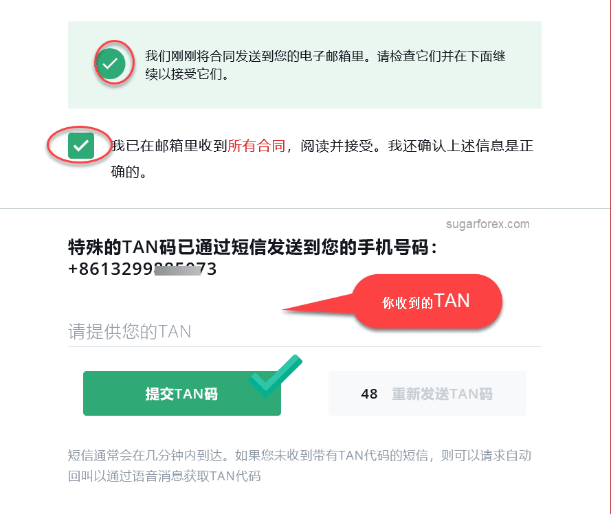 Seleziona tutte le caselle, clicca su Richiedi TAN via SMS e il contratto verrà ricevuto via email.