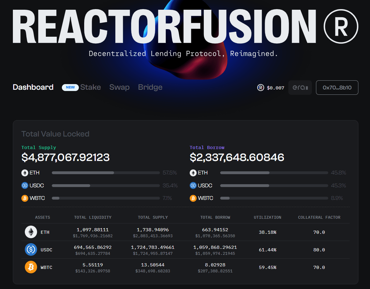 ReactorFusion è un protocollo di prestito decentralizzato su zkSync Era, un progetto basato su Compound Finance, che offre un modello economico basato su token unico chiamato Bribe-Reward.