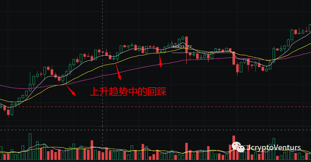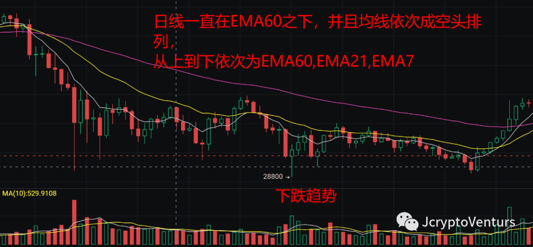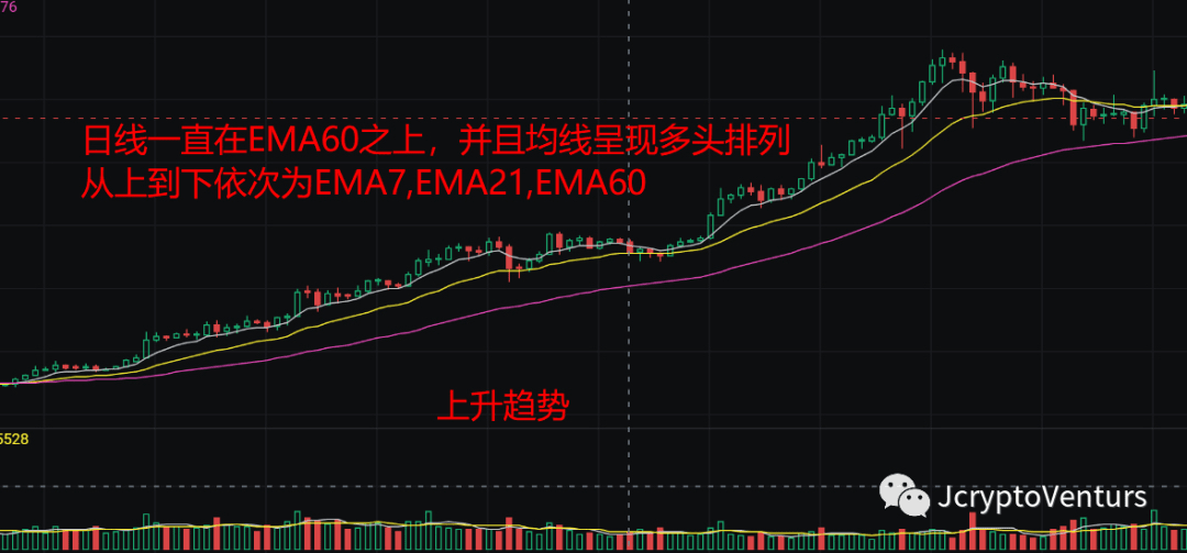 ② Determinare il trend: determinare innanzitutto la direzione generale, se il trend futuro è al rialzo o al ribasso. Se è al rialzo, sceglierai solo il punto chiave per entrare nel mercato per andare long. Se è al ribasso, sceglierai solo il punto chiave per entrare nel mercato per andare short. Allora come giudicare la direzione generale? Utilizzo l'EMA60 giornaliero per determinare la direzione generale del futuro. Il K giornaliero ha un trend al rialzo sopra l'EMA60 e il K giornaliero ha un trend al ribasso sotto l'EMA60.