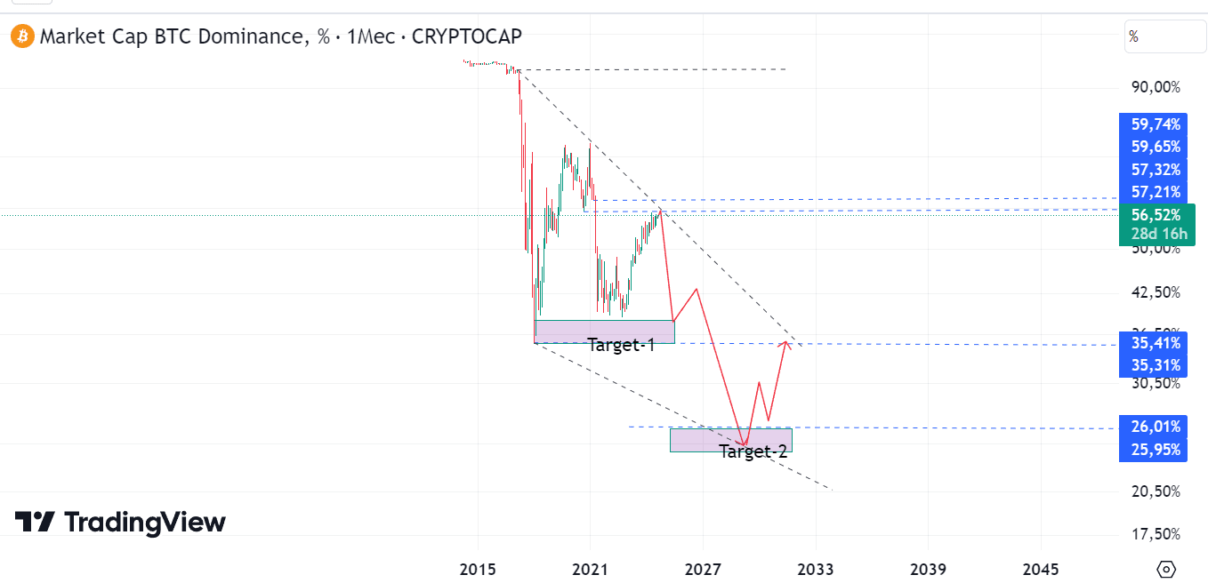 -Penso che dalla zona 57,5-60%, l'attuale tendenza verrà interrotta e il denaro inizierà a fluire verso le altcoin, pompando principalmente coppie verso BTC, il che influenzerà direttamente le coppie verso USDT.