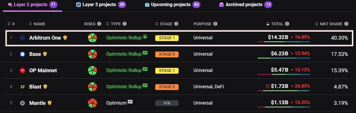 👉In termini complessivi del segmento Layer2, TVL di Arbitrum è leader con 14,2 miliardi di dollari. Si noti che i dati TVL differiscono in modo abbastanza significativo tra le piattaforme, a causa della formula di calcolo e del fatto che siano incluse o meno le risorse in picchettamento nell'ecosistema.