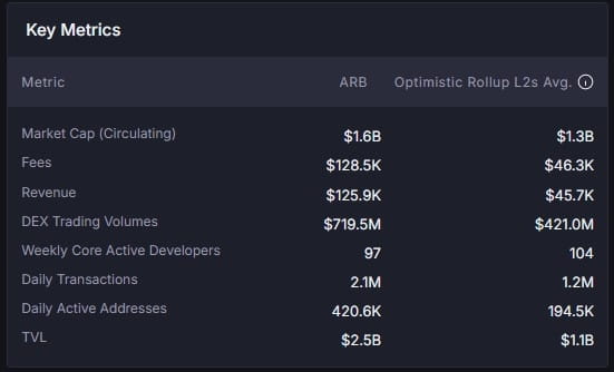 👉Per quanto riguarda la panoramica degli indicatori più importanti per un progetto Layer2, Arbitrum mostra anche prestazioni eccezionali rispetto alla media dei concorrenti. Puoi seguire nella tabella qui sotto! Gli indicatori per il confronto includono: capitalizzazione, commissioni, entrate, volume DEX, numero medio di transazioni/24 ore, indirizzi attivi medi/24 ore...