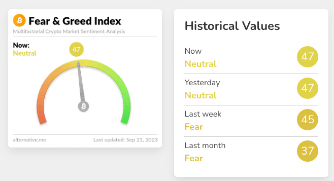 L’indice Fear and Greed mostra che il sentiment del mercato è passato dalla paura alla neutralità dal mese scorso ad oggi.