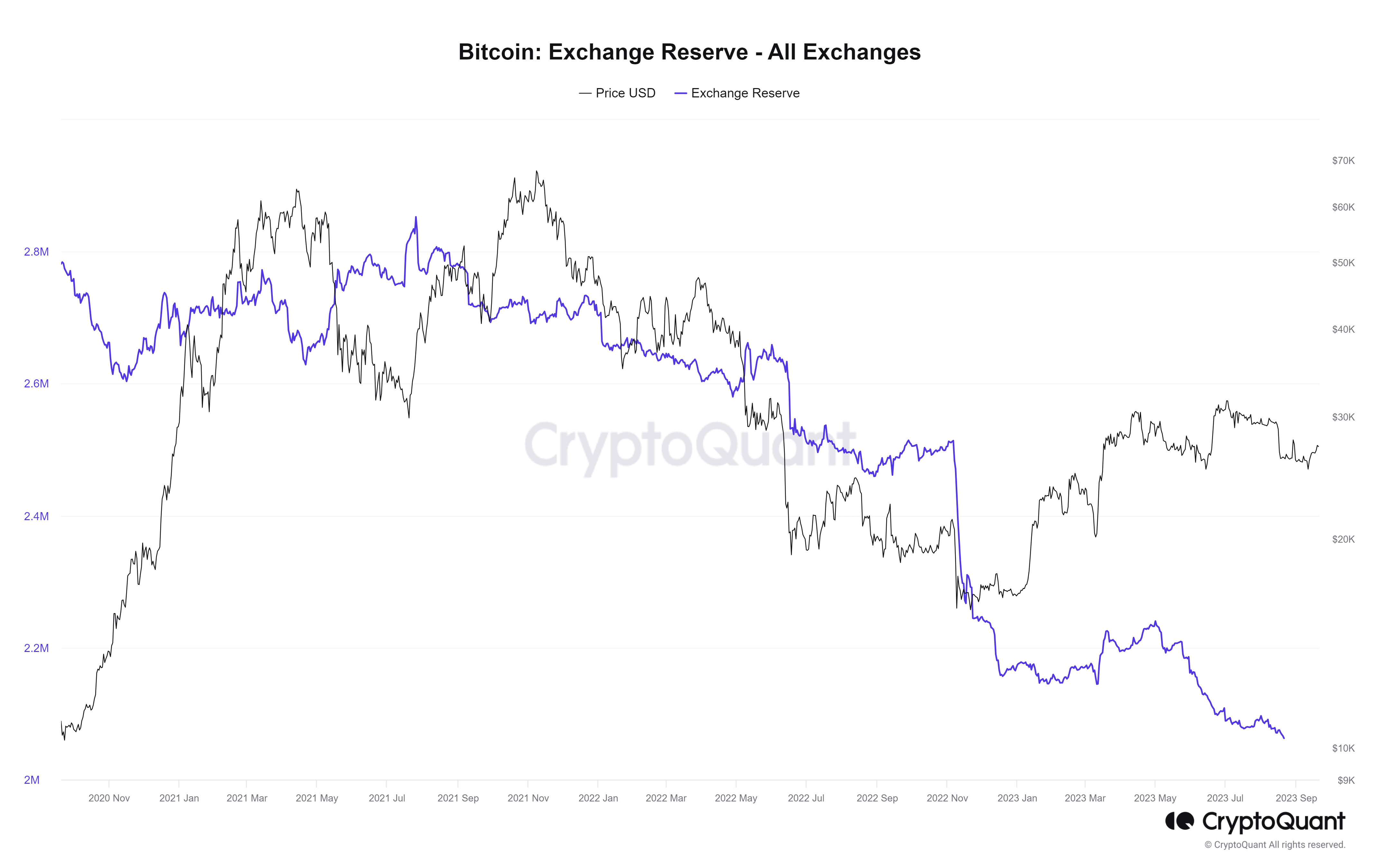 I grafici CryptoQuant riflettono anche i prelievi di Bitcoin dagli scambi; una cifra in costante diminuzione da luglio 2021, con poco più di 2 milioni di BTC rimasti sugli exchange.