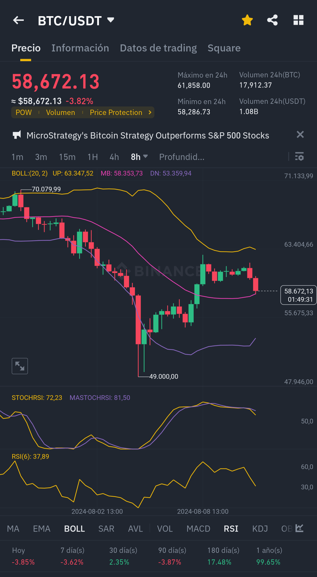 - **Prezzo attuale**: 58.672,13 USDT, in calo del -3,82% nelle ultime 24 ore.