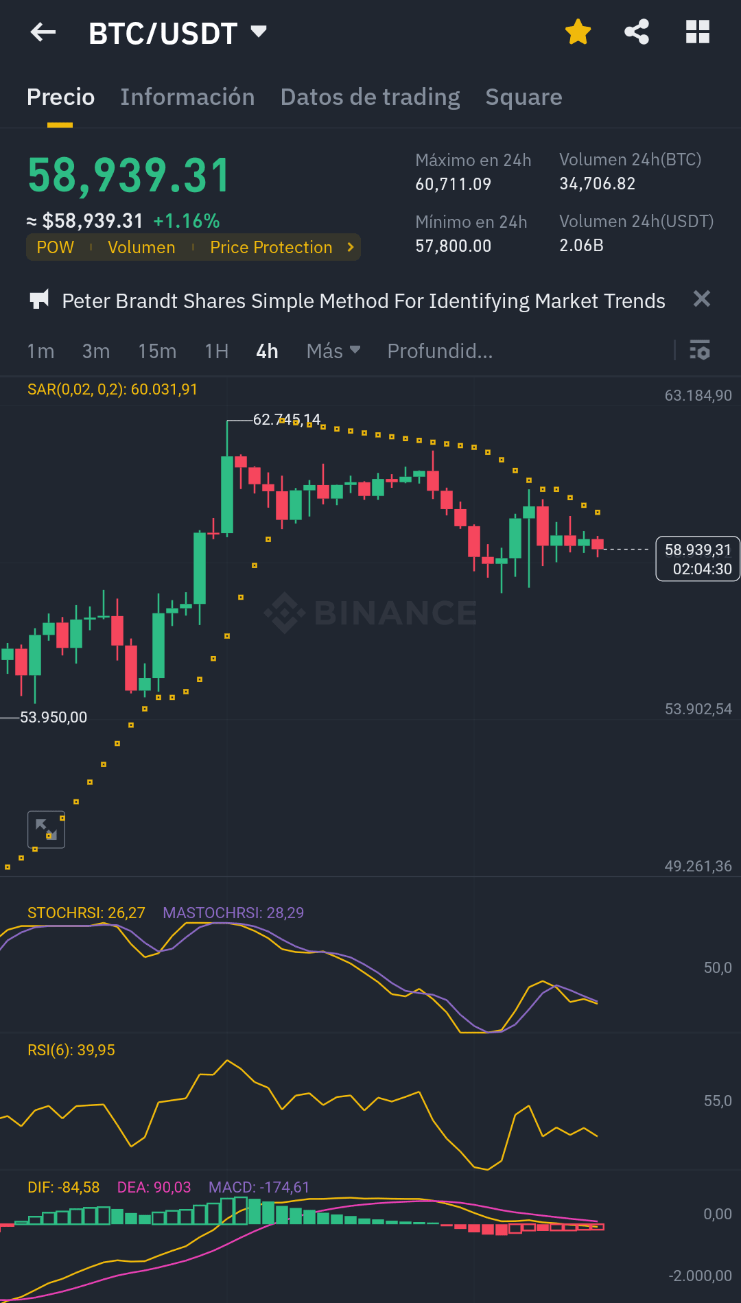 2. **Volume 24 ore:** 34.706,82 BTC e 2,06 miliardi di USDT.