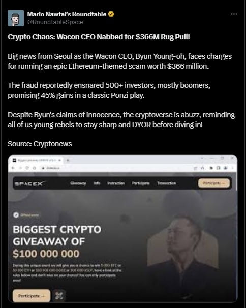 Un CEO sudcoreano sarebbe stato arrestato per aver presumibilmente orchestrato un enorme schema Ponzi che ha truffato gli investitori per una cifra stimata di 366 milioni di dollari. Secondo un rapporto di Crypto news, Byun Young-oh, il capo di Wakon, una piattaforma di criptovaluta, è accusato di aver gestito lo schema insieme a un complice di nome Yeom.