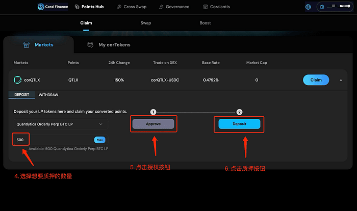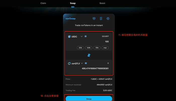 9. Per gli utenti che non hanno molti corQTLX sbloccati, possono prima utilizzare USDC per acquistare corQTLX su DEX di Coral.
