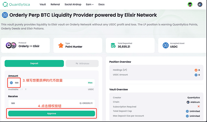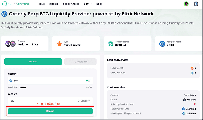 3. Nella schermata di Deposite, inserisci la quantità di USDC o ETH che desideri mettere in staking.