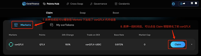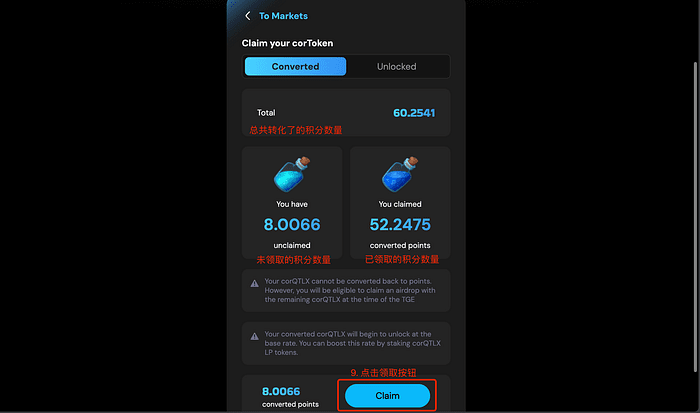 7. Dopo aver effettuato lo staking per un certo periodo, fai clic su Claim per ricevere il corQTLX attualmente convertito (il corQTLX qui è in stato di blocco).