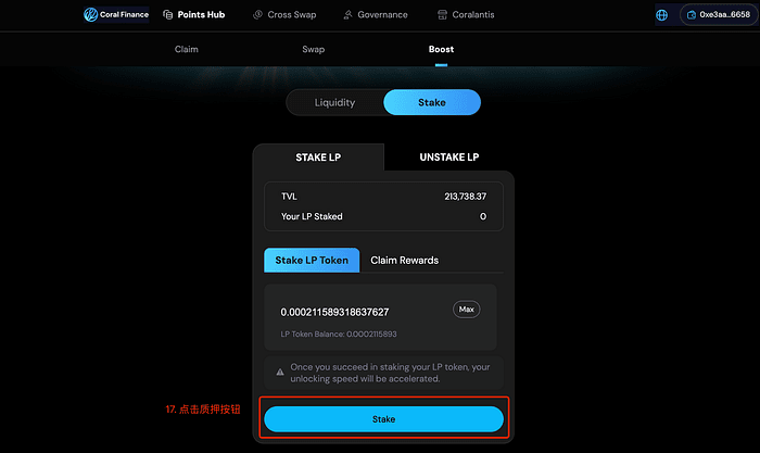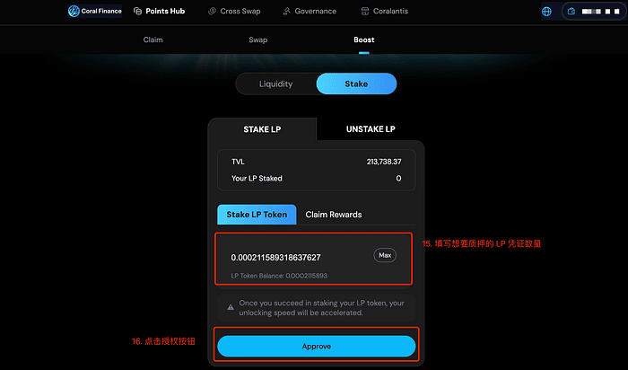 11. Se desideri ottenere maggiori profitti, puoi anche mettere in staking il certificato LP appena aggiunto per ottenere ulteriori ricompense di airdrop da Coral Finance.