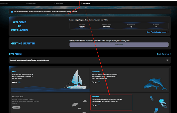 Dopo aver completato lo staking di Quantlytica, accedi al sito ufficiale di Coral Finance, link ufficiale: https://d-app.coraldex.finance/activity?code=9bTyOypf