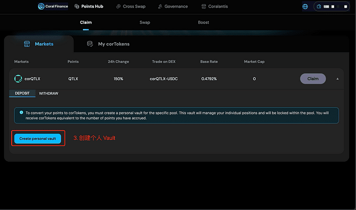 3. Crea un Vault personale per consentire di mettere in staking il certificato di staking di Quantlytica su Coral Finance.