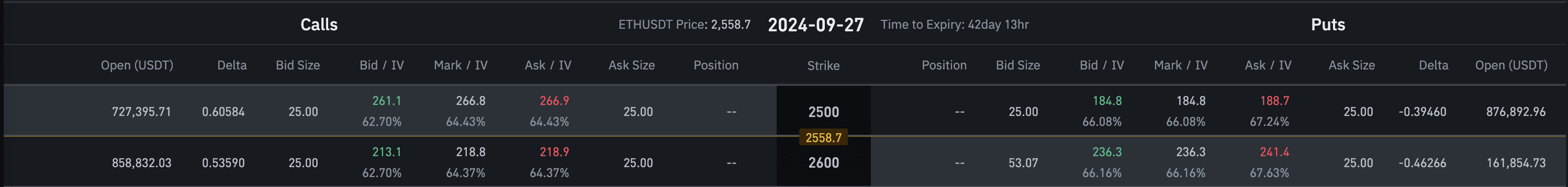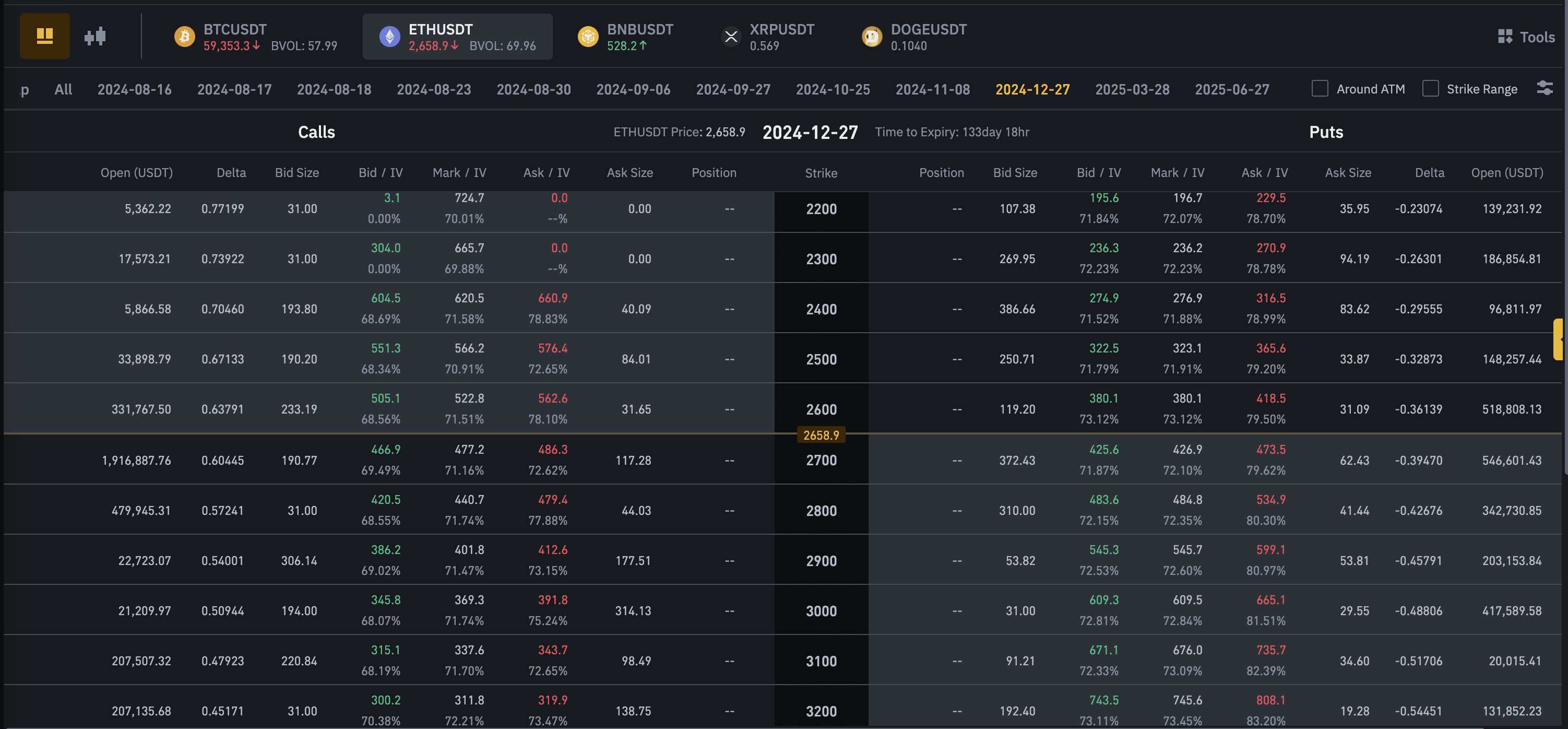 I contratti Out of The Money (OTM) sono quelli in cui il prezzo di strike è al di fuori del prezzo del prodotto. ETH è attualmente a $2,660, e se vuoi acquistare un contratto call a 3k, il prezzo sarà molto più economico perché il prezzo è lontano dal contratto che stai acquistando. Puoi vedere i contratti ITM in grigio chiaro e quelli OTM in grigio scuro.