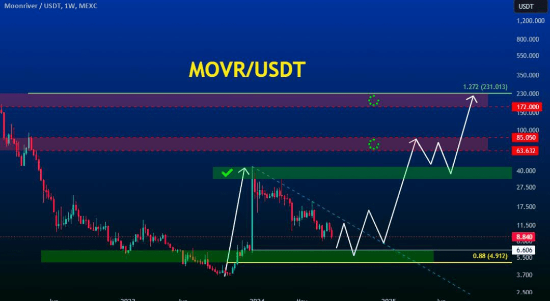 Questa analisi evidenzia una configurazione promettente per MOVR/USDT, sottolineando l'importanza dei livelli chiave di supporto e resistenza e il potenziale per un sostanziale breakout rialzista.