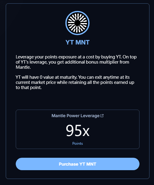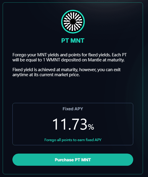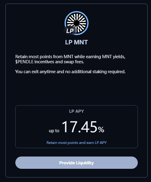 Attraverso Pendle, i detentori di MNT possono scambiare MNT con YT (reddito con punti leva), PT (reddito fisso) o fornire liquidità LP. Vengono rispettivamente spiegati: