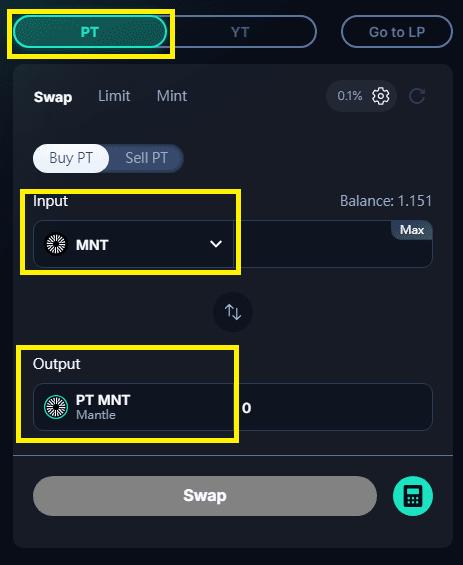 Metodo operativo: dopo essere entrati nella pagina PT, seleziona il token investito da Input. Puoi vedere quanto PT MNT può essere scambiato in Output, come mostrato di seguito.