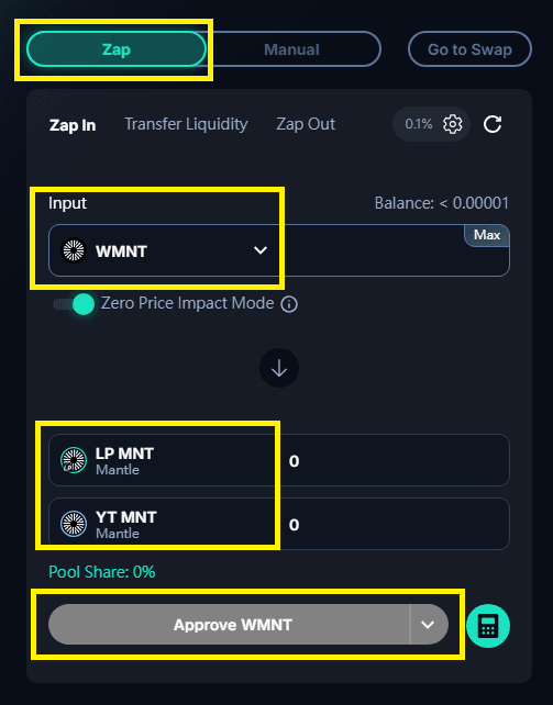 Metodo operativo: dopo essere entrati nella pagina Zap di LP, seleziona il token da investire da Input. Puoi vedere quanto LP MNT+YT MNT può essere scambiato in Output, quindi fai clic su Approva e poi su Zap In, come mostrato di seguito.