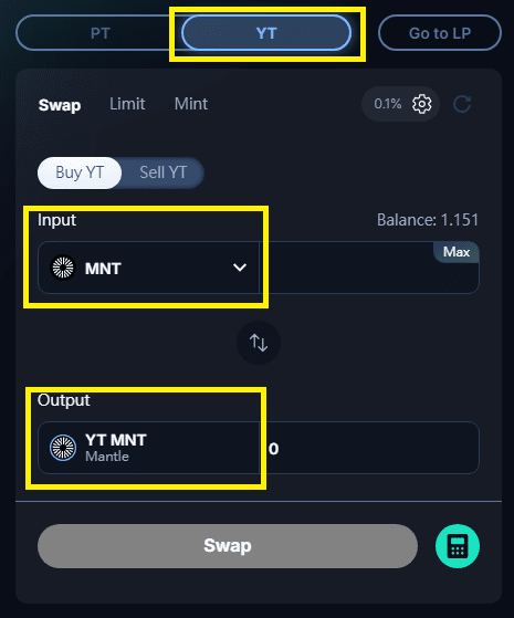 Metodo operativo: dopo essere entrati nella pagina YT, seleziona il token da investire da Input. Puoi vedere quanto YT MNT può essere scambiato in Output, come mostrato di seguito.