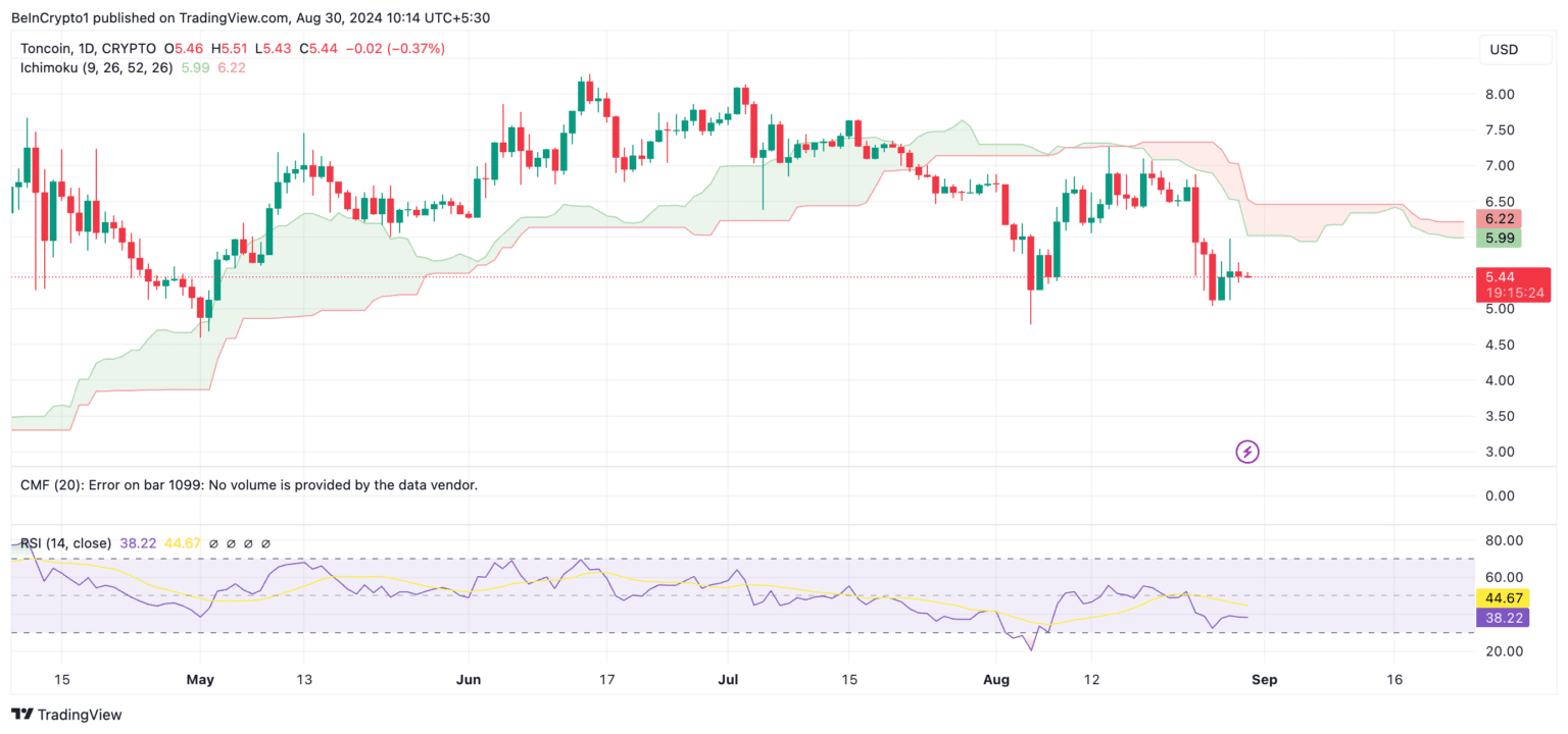 Il valore di Toncoin (TON) è in calo dall'arresto del CEO di Telegram Pavel Durov il 24 agosto. Attualmente scambiato a $ 5,45, il prezzo del token è sceso del 20%.