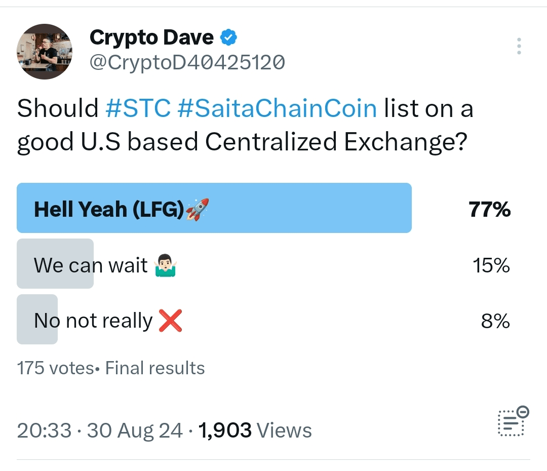 Il mondo delle criptovalute prospera grazie al coinvolgimento della comunità e niente lo illustra meglio del recente sondaggio condotto da Crypto Dave sul futuro di SaitaChain Coin (#STC). La domanda posta era semplice: #STCdovrebbe essere quotato su un buon exchange centralizzato con sede negli Stati Uniti?" La risposta è stata estremamente positiva, con il 77% dei 175 partecipanti che hanno votato "Hell Yeah (LFG) 🚀".