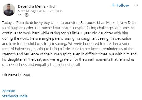 Devendra Mehra, direttore del punto vendita Starbucks nel Khan Market di Delhi, ha recentemente condiviso una storia sentita di un uomo che lavora come addetto alle consegne di Zomato, un padre single che si prende cura della figlia di due anni. In un post su LinkedIn, Mehra ha condiviso una foto dell'uomo con la figlia.
