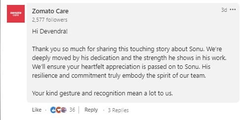 Dopo che il post è venuto alla luce, Zomato Care ha ringraziato Mehra per aver riconosciuto l'agente di consegna. "Grazie mille per aver condiviso questa toccante storia su Sonu. Siamo profondamente commossi dalla sua dedizione e dalla forza che dimostra nel suo lavoro. Faremo in modo che il tuo sentito apprezzamento venga trasmesso a Sonu. La sua resilienza e il suo impegno incarnano davvero lo spirito del nostro team. Il tuo gesto gentile e il tuo riconoscimento significano molto per noi", ha scritto l'azienda.
