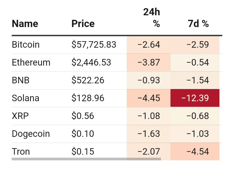Con riferimento a CoinMarketCap mercoledì (9/4/2024) alle 06:11 WIB, il mercato delle criptovalute si è mosso al ribasso. Il Bitcoin è sceso del 2,64% a 57.725,83 dollari e si trovava nella zona rossa del 2,59% su base settimanale.